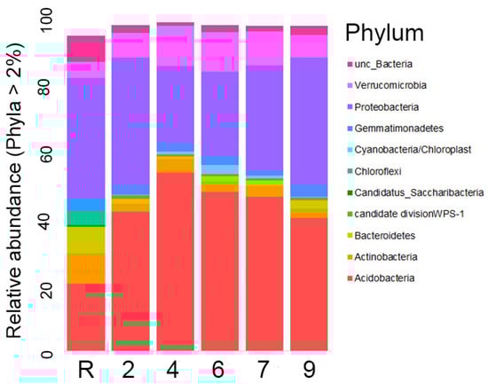 The present study was conducted at experimental recultivation site number 20, which was established in the territory of severe oil pollution to investigate the efficacy of different remediation techniques using various biological products. The bioremediation experiment described in detail in [,] was initiated in 2002, 13 years after the occurrence of the oil spill. The study site was subjected to preparatory measures prior to recultivation which included removal of oil from the surface; drainage of excess water; and plowing up to a depth of 25–30 cm. The territory was divided into nine sites where several biorecultivation techniques were tried out. In 2019, soil samples were taken from six of these sites for metagenomic and chemical analysis (the original numbering of the sites was retained). Site 2 did not undergo any recultivation measures, while sites 4, 6, 7, and 9 were treated with biopreparations, herb seeds, and fertilization (Table 1). Site R is the reference site located in similar edaphotopic conditions with other studying sites, but it remained unaffected by oil contamination and other anthropogenic influences.