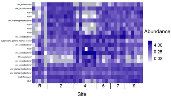 The bacterial communities’ diversity in areas contaminated with crude oil remains notably lower than that of the reference site. An analysis of the top 20 OTUs with maximal abundances, as depicted in Figure 6, reveals that 13 out of these 20 OTUs belong to Acidobacteria. The remaining five OTUs are associated with Proteobacteria, while the last is assigned to the unknown Subdivision 3 genera incertae sedis, which is abundant in a majority of the samples analyzed. Moreover, the abundances of these top 20 OTUs vary significantly across the contaminated sites. The absence of six to ten representatives of the top 20 OTUs at the reference site is noteworthy, indicating a significant divergence in community composition. Furthermore, a majority of the remaining OTUs display low abundances, with only two OTUs persisting as dominant across all sites under study. Moreover, site 4 exhibits the complete absence of one to seven OTUs from the top 20 list, while simultaneously demonstrating maximal abundances among the soil samples. The distribution of the top 20 OTUs across the other sites is relatively even, with their abundances falling within the average range. However, exceptions are observed in OTU_6 (unc_Mycobacterium) and OTU_7 (unknown Acidobacteria), which display a low abundance at sites 2 and 9.
