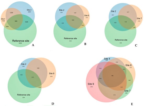 The number of common and unique OTU detected at experimental sites. (A) reference site, and sites 2 and 4; (B) reference site, and sites 2 and 6; (C) reference site, and sites 2 and 7; (D) reference site, and sites 2 and 9; and (E) sites 4, 6, 7, and 9. Figures are the number of OTUs.
