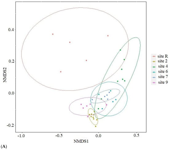 Statistical processing of the data was carried out using Microsoft Office Excel (Microsoft Office, Redmond, WA, USA) and the R programming language []. The table shows mean values and standard deviations. The values of the Chao-1 and Shannon α-biodiversity indices calculated for each individual sample were averaged to obtain the value characterizing the site. All values of the fraction reads annotated for one or another OTU were also averaged among the samples of one site. Differences in α-biodiversity indices of experimental sites and differential abundances were assessed using the Mann–Whitney test. All multiple comparisons were performed with false discovery rate (FDR) correction. Those OTUs that accounted for more than 1% of all 16S rDNA or ITS reads were considered dominant. A nonmetric multidimensional scaling (NMDS) analysis was performed with the R programming language [,].