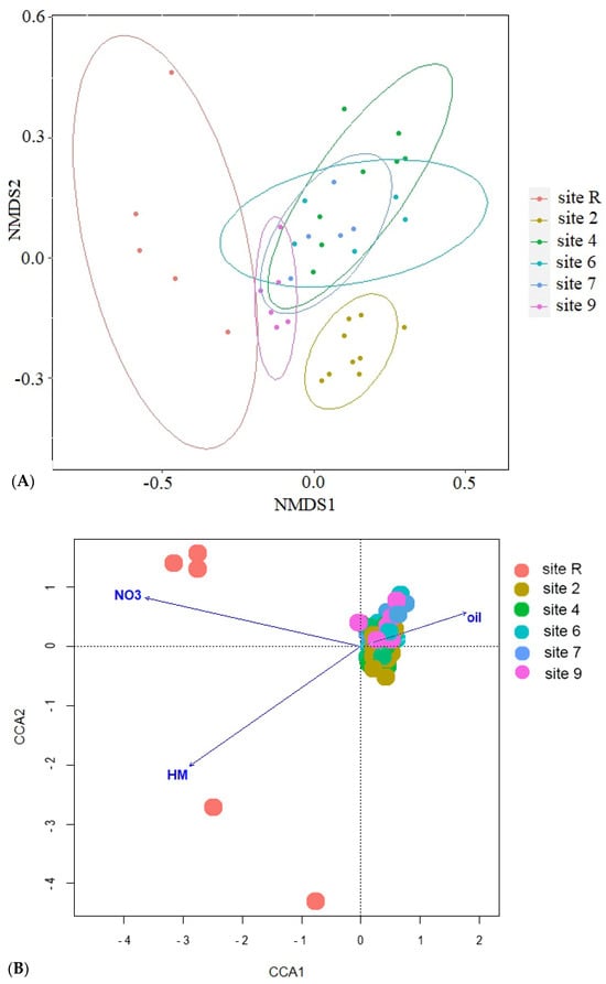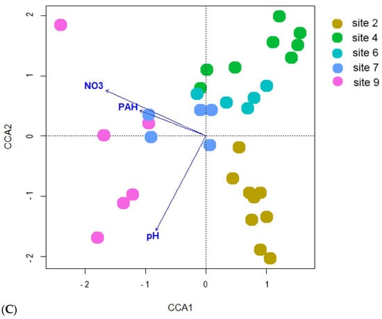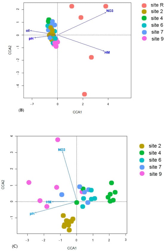 According to the Bray–Curtis distance ordination (Figure 13), it is observed that all the sites subjected to biological recultivation in the presence of oil contamination exhibit a tendency to aggregate together within the sample space. This clustering phenomenon is further substantiated by the isolated positioning of the reference site and site 2, wherein the latter has encountered mechanical reclamation solely targeting the upper soil layer. Furthermore, a concomitant investigation into the bacterial communities revealed the emergence of notable associations with the soil chemical characteristics, as substantiated when utilizing the constrained method (Figure 13B). The sample ordination is determined based on various soil properties, including NO3 content (p = 0.005), heavy metals (Cu, Zn, Pb and Cd, p = 0.01), and crude oil (p = 0.015). It is shown that points belonging to contaminated sites form a densely clustered group, while points corresponding to the reference site are located separately from the other samples, indicating considerable spatial separation. Upon excluding the reference samples from the analysis (Figure 8C), it becomes evident that soil factors such as NO3 content (p = 0.005), pH (p = 0.01), and PAH level (p = 0.01) play significant roles affecting the ordination patterns of the samples. Additionally, similar to the analysis of bacteria diversity, points representing site 2, which underwent the mechanical cleaning of crude oil, form a separate group.