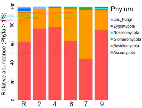Relative abundance of different fungi phyla on sites studied (the abundance of each phylum is more than 1%).