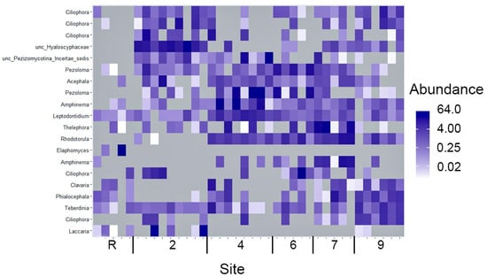 The differences in fungi communities most probably resulted from the mycorrhizal species diversity and abundance (Figure 10 and Figure 11). For instance, on the reference site, 13 from 19 representatives of the Sebacinales family have been identified, indicating their ability to form mycorrhizal associations with both deciduous and coniferous trees, as well as Marchantiophyta []. In contrast, contaminated sites show a much lower presence of this family, typically ranging from 1 to 5 OTUs. The abundance of OTU76 on the reference site is 25 times higher than that found on contaminated sites. Similar patterns were observed for representatives of the Glomeromycetes order, able to form mycorrhizae with a variety of vascular plants and Bryophyta thallus. The reference site showcases the presence of eight Diversiporales OTUs and 32 Glomerales OTUs. Some of the Glomerales were also found on sites 4–9; their abundance and diversity were significantly lower. Notably, site 2 does not harbor any Glomeromycetes.