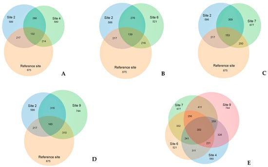 The number of common and unique OTUs detected at experimental sites. (A) reference site, sites 2 and 4; (B) reference site, sites 2 and 6; (C) reference site, sites 2 and 7; (D) reference site, sites 2 and 9; (E) sites 4, 6, 7, and 9. Figures are the number of OTUs.