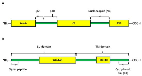 Domains and regions present in Gag polyprotein (A) and in Env protein (B). Yellow boxes are hits present in the CDD database. Green bars are sequences present in GenBank but that did not identify hits in the CDD database. CA, capsid protein; RVP, RetroViral Protease-like domain; SU surface; TM, transmembrane; HR1-HR2, heptad repeat regions 1 and 2. The signal peptide is involved in protein maturation and is cleaved at the 3′ end [52]. We have included the signal peptide when making our phylogenies. gp85 (SU) CDD hit only detects part of the SU domain.