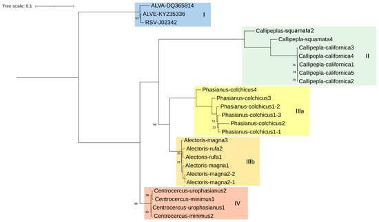 The ERV gag ORFs phylogenetic tree followed a similar distribution to the general one mentioned above. However, Clade IIIb (Alectoris spp. ERVs) seemed to be closer to Clade IV (Centrocercus spp. ERVs) than to Clade IIIa (Phasianus colchicus ERVs), contrary to other regions (Figure S3).