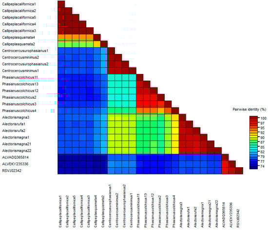In an effort to uncover the non-studied ALV-like ERVs, we attempted to search the genomes of different avian orders published in the UCSC database, one of the most complete, fast, and easy-to-use databases. Dimcheff et al. [21] reported the presence of ALV-like loci in 26 species of Galliformes using partial gag sequences. These included most of the species for which we have obtained proviral sequences: Phasianus colchicus, Centrocercus urophasianus, Lagopus leucura, Tympanuchus pallidicinctus, Colinus virginianus, and Callipepla californica. Genomes from other Galliformes studied by Dimchef et al. [21], such as Numida mealeagris, did not give results in the search in the UCSC database, while others, such as Colinus virginianus and Tympanuchus cupido, offered poor quality contigs. To obtain these sequences, we consulted the GenBank database. It is worth noting that new ALV-like sequences were not detected in the genomes of other avian orders (Table S1), making it an exclusive Galliformes character. Unfortunately, the genomes of African, Oceanian, and South American Galliformes, with which it would have been interesting to compare, are missing from the databases at the time of this study.