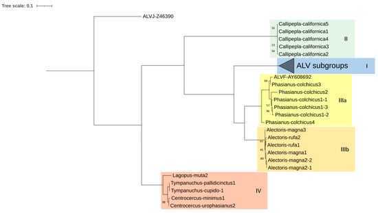 Maximum likelihood tree based on env CDS DNA sequences (1887 bp) of several proviruses detected in seven species of Galliformes using the K2 + G+ I method (bootstrap value = 1000 replicates). I, II, IIIa, IIIb and IV denotate the proposed clades. Clade I contains ALV-A, B, E, K, and RSV-C, D sequences, and it has been collapsed for a better understanding of the figure. Only bootstrap values lower than 100% are displayed.