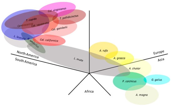 Schematic representation of the native distribution map of hosts that carry the studied proviruses. Data from Bird Life International (https://www.birdlife.org/ (accessed on 21 September 2023)). Each section corresponds to a geographical region. Other relevant species have been included: Bonasa umbellus, Callipepla gambelii, Alectoris graeca, A. chukar, and Gallus gallus. A., Alectoris; B., Bonasa; Cal., Callipepla; Col., Colinus; G., Gallus; L., Lagopus; P., Phasianus; T., Tympanuchus. Oval overlapping is indicative of native habitat overlapping between species. Close distribution limits between species of less than 100 km have been considered overlapping since they may mean a possibility of interspecies contact. Oval size or degree of overlapping between ovals does not correspond with quantitative values.