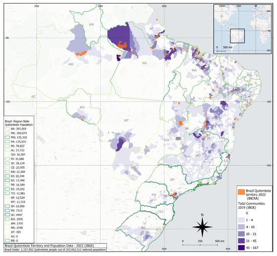 Map of current quilombola communities in Brazil, with state distribution per population and density (purple), with the recent areas officially recognized in 2022 (orange) by INCRA (Brazilian Government).