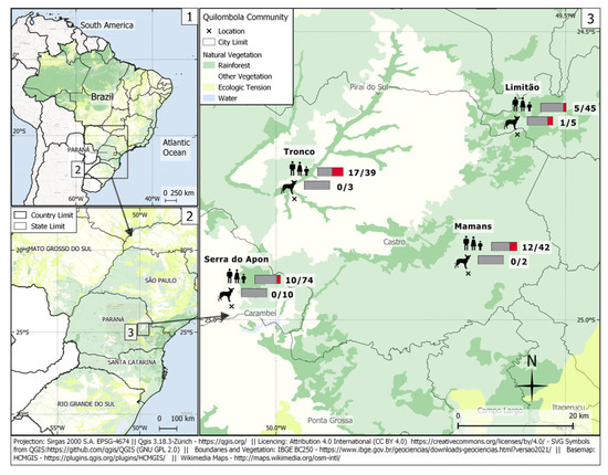 This study was conducted with humans (n = 200) and dogs (n = 20) belonging to four Brazilian quilombola communities located in rural regions of the state of Paraná, southern Brazil. The four quilombos (Limitão, Mamans, Serra do Apon, and Tronco) were established during the late 19th century by individuals fleeing and seeking refuge from Black slavery. Livelihoods primarily cultivated yerba mate plants and engaged in livestock-related activities, later through subsistence agriculture, rudimentary livestock, and handmade crafting [11]. These communities were located about 50 to 60 km (31 to 37 miles) from the main roads, solely connected by unmaintained gravel and sand roads at the time [11].