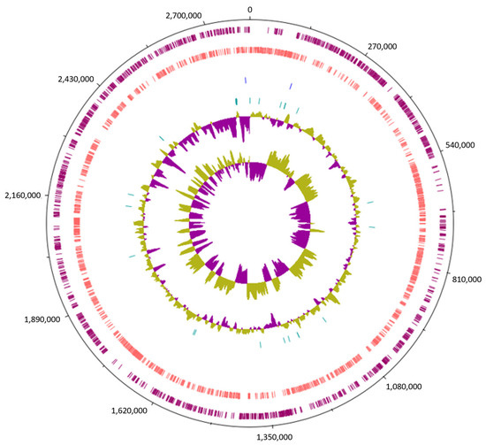 Circular genome map of Lc. paracasei SRX10, constructed using Artemis. From outer to inner circle, the genomic features presented are: forward strand CDS (burgundy), reverse strand CDS (pink), rRNA genes (blue), tRNA genes (green), GC content, and GC skew.