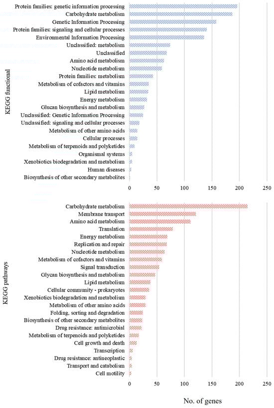 The protein sequences of Lc. paracasei SRX10 are categorized into 20 COGs. The most represented category is “Function Unknown” (S, 20.37%), followed by “Carbohydrate metabolism and transport” (G, 8.37%), “Transcription” (K, 8.33%), “Amino Acid metabolism and transport” (E, 7.42%), “Translation” (J, 6.62%), and “Replication and repair” (L, 5.98%) (Table S1). Additionally, KEGG assignment to functional categories and pathways led to the classification of predicted proteins into 191 pathways and 23 functional categories (Figure 2). The most represented pathway is “Carbohydrate metabolism” with 215 proteins, followed by “Membrane transport” and “Amino acid metabolism” with 121 and 111 proteins, respectively.