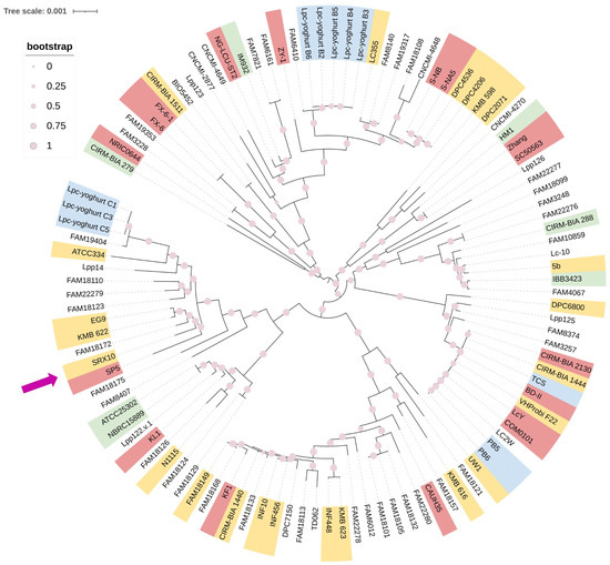 Approximately maximum likelihood phylogenetic tree of Lc. paracasei strains isolated from dairy products (pink—fermented milk products, yellow—cheese, blue—yoghurt, green—raw milk products) based on orthologous genes calculated with Roary (version 3.13.0) and built with 1000 bootstrap replications. The purple arrow indicates the position of Lc. paracasei SRX10 in the phylogenetic tree.