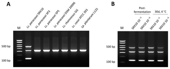 Primer design based on unique regions of the WGS of Lc. paracasei SRX10 was performed following a previously published methodology [16]. Amplification reactions were performed at a final volume of 20 μL, consisting of 5 units Taq DNA polymerase (Minotech, Heraklion, Greece), 10 mM of each dNTP (Jena Bioscience, Jena, Germany), 1.5 mM MgCl2 (Minotech), 1× Taq polymerase buffer (Minotech), and 10 ng of DNA template. Primers were added at a final volume of 1 μL, for a final amount of 25 pmol in each reaction. The universal bacterial primer set LacF/LacR targeting the 16S rDNA gene of lactobacilli [43] served as a positive control. Reactions were carried out in the Veriti thermocycler (Applied Biosystems, Waltham, MA, USA) using the following conditions: 94 °C (1 min), followed by 25 cycles of 94 °C (45 s), 58 °C (30 s), 72 °C (1 min), followed by a final extension step at 72 °C (10 min). The PCR products were separated on 2% (w/v) agarose gels, visualized under UV illumination, and photographed with a digital camera (Gel Doc EQ System, Bio-Rad, Hercules, CA, USA).