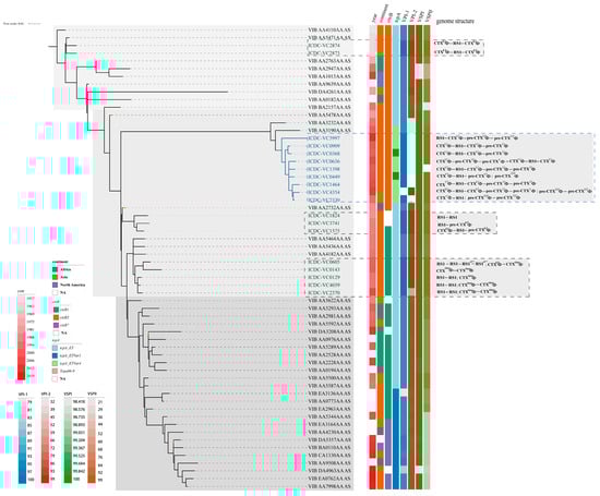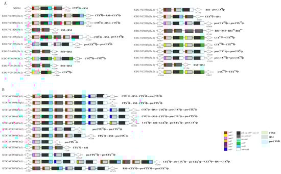 The members and co-integration arrangements of CTXΦ/pre-CTXΦ prophages in serogroup O139 strains were highly complex compared with those in serogroup O1 strains, presenting the bloom period of the CTXΦ/pre-CTXΦ prophage family during wave 2 of the seventh cholera pandemic. Wave 2 strains can be classified into three clusters (Figure 2). The first cluster is characterized by one or more copies of CTXΦ and the absence of RS1-associated elements. In this cluster, five strains (ICDC-VC0605, 0143, 0129, 4039, and 2370) appeared after 2000, and four O1 strains contain two CTXclassΦ sequences (rstRclass, ctxB1). The three strains (ICD-VC0129, 4039, and 2370) exhibited the presence of the “RS1-RS1” gene structure in Chr. 2. The emergence of this arrangement can be attributed to the infection of class strains by CTXETΦ strains, resulting in the exchange of genes between rstRET and rstRclass: first, CTXETΦ infected classical strains, resulting in the loss of CTXclassΦ; second, CTXETΦ was lost from the large chromosome, allowing the integration of CTXclassΦ into the small chromosome [37,38]. The second cluster comprises three strains, namely, ICDC-VC1824, 3741, and 1575. Among the pandemic strains, VC1575 has a typical “CTXΦ-RS1” structure of the ET biotype [36] but contains an additional integration of pre-CTXZJΦ. VC3741 has the skeleton of the seventh pandemic strain, and it is postulated that it may have lost the ctxAB gene in a specific environment, thereby becoming a strain that only carries pre-CTXΦ. VC1824 contains RS1 elements exclusively and may have lost pre-CTXΦ based on the genome structure of VC3741. The third cluster contains O139 strains with CTXETΦ, different pre-CTXΦ types, and RS1 elements. ICDC-VC2530 exhibits CTXETΦ-RS1, while the remaining strains have complex CTXΦ arrays. The most prevalent structure is CTXETΦ-RS1-CTXETΦ, followed by the duplication of pre-CTXΦ forms, some of which are present in multiple copies. These results indicate that the serogroup O139 strains exhibited a higher complexity, functional activity, and structural diversity than the serogroup O1 strains, resulting in the dissemination of CTXΦ/pre-CTXΦ family members.
