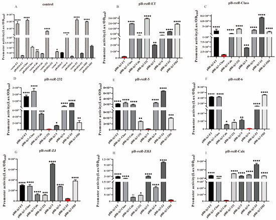 Different RstR alleles specifically repress their corresponding rstA (ig-2) promoters. Under identical culture conditions, the activity of each ig-2 promoter is regulated by the expression of the corresponding RstR. (A) Eight pBBR-lux reporter plasmids were constructed for blank control group experiments to demonstrate the feasibility of plasmid construction. (B–I) Analysis of promoter activity using a pBBR-lux reporter plasmid fused with different rstA promoters and a pBAD24 plasmid containing an rstR allele (ET, class, 232, 5, 6, ZJ, ZHJ and Calc, respectively). Each rstR allele specifically inhibited the luminescence of the corresponding promoter, indicating the inhibition of rstAB expression. Data are means and standard deviations of three independent experiments * p < 0.0143, ** p < 0.0028, *** p < 0.002, **** p < 0.0001 ( * if the p-value was less than 0.05, ** if the p-value was less than 0.01, *** if the p-value was less than 0.001, **** if the p-value was less than 0.0001, and ns for no significant difference).