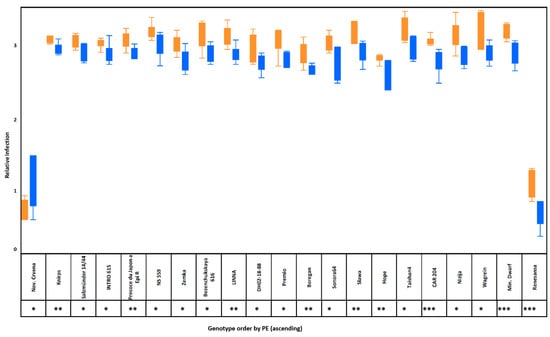 Whisker box plot of relative infection for twenty-one genotypes, which indicates a significant difference between attM (orange) and expR+ch (blue) treated plants. Significant difference between treatments for each genotype is shown with the star (*: p < 0.05, **: p < 0.01 and ***: p < 0.001, respectively).
