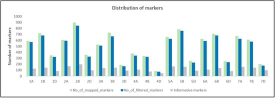 Distribution of markers across chromosomes. Colored bars indicate the number of mapped markers on the reference genome (green); filtered markers representing missing value, MAF, and heterozygosity (blue); and informative markers (grey), respectively.
