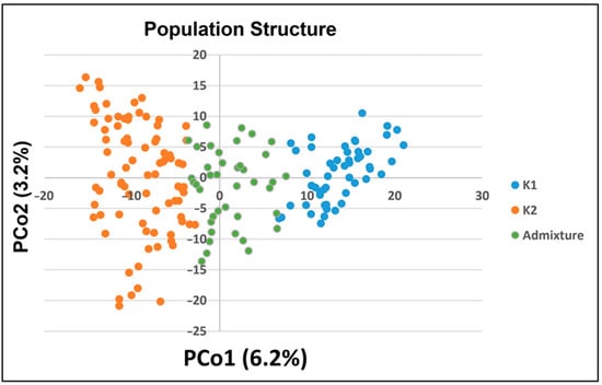 The Bayesian clustering analysis in STRUCTURE revealed an optimal number of two subpopulation clusters (K = 2, Figure S3 and Figure 3). Genotypes were clustered according to their membership coefficients. Genotypes with a membership coefficient ≥ 0.7 to one of the clusters were assigned to the corresponding cluster. Genotypes with a membership coefficient < 0.7 to one of the groups were assigned to the admixed cluster. In total, 53, 82, and 40 genotypes were assigned to cluster 1 (blue) or 2 (orange) or the admixed (green) cluster (Figure 3). Cluster K1 comprised 82.7% genotypes originating from Europe, 3.8% from South America and Australia, 1.9% from North America, and 7.7% without information about country of origin. Cluster K2 contained 47.0%, 25.3%, 18.1%, 2.4%, 2.4%, and 1.2% genotypes from Europe, North America, Asia, South America, Australia, and Africa, respectively. No origin information about the country of origin was available for 3.6% of genotypes in cluster K2. The admixed cluster comprised 62.5% genotypes from Europe, 12.5% from Asia, 5% from South America, 12.5% from North America, 2.5% from Australia, and 5% without information about country of origin. A Principal Coordinate Analysis plot was used to visualize the results of the Bayesian cluster analysis (Figure 3). The first Principal coordinate (PCo) explained 6.2% of the variability, and the second PCo explained 3.2%. The results of both analyses indicated a weak to moderate population structure. No distinct clusters were observed based on origin or different plant breeding status.