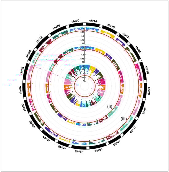 Circular Manhattan plot showing GWAS results for PE (i), RI for expR+ch (ii), and RI for attM (iii), respectively. From inner to outer circle: (i), (ii), and (iii).