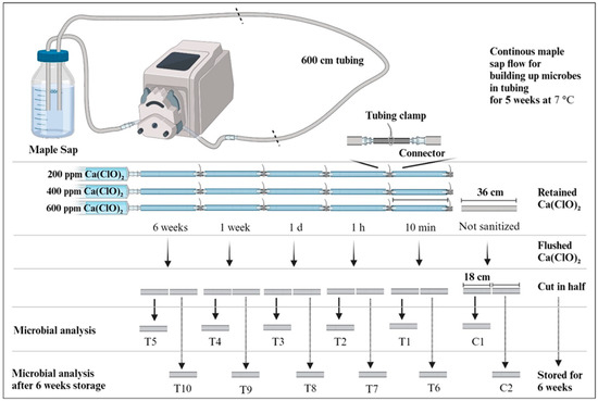 Fresh maple sap was obtained from a research field site in Franklin, West Virginia, at the beginning of the maple sap collection season (31 January 2023) and stored at −20 °C. 500 mL of frozen sap was thawed in running tap water and connected to 600 cm of 3/16-inch semi-rigid sap collection tubing to build up microbial mass within the tubing (Roth Sugar Bush, Cadott, WI, USA). As shown in Figure 1, the sap was continuously flowed through the tubing at a rate of 2 mL/min using a peristaltic pump (BT100L, Golander Pump, GA, USA). The entire system, including the sap, tubing, and pump, was then placed in a 7 °C refrigerated incubator for a duration of 5 weeks. For comparison purposes, two 30 cm segments, aged two years and devoid of any sanitation, were acquired from a maple sap producer in Maine.