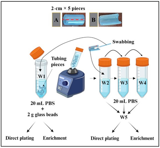 Initially, a 10-cm sanitized tube section was cut into five 2-cm pieces (Figure 2A). The five tubing pieces were then halved (Figure 2B), resulting in 10 pieces. These segments were placed in a 50 mL tube (Figure 2, W1) containing 2 g of 3-mm glass beads (Supelco, Burlington, MA, USA) and 20 mL of phosphate-buffered saline (PBS; EMD Millipore, Burlington, MA, USA). After vortexing at maximum speed using an Analog vortex mixer (VWR, Radnor, PA, USA) for 1 min, the interior of all the tubes was swabbed back and forth 10 times with a cotton swab using plastic handled cotton swabs (Fisherbrand™, Pittsburgh, PA, USA). The swabs were then immersed in the W1. Subsequently, the tubing pieces were sequentially transferred to three separate 50 mL tubes (W2-W4) containing 20 mL of PBS for the rinsing process.