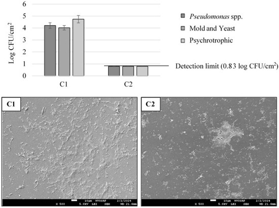 The initial microbial counts from the frozen sap were 3.5 ± 0.3, 3.0 ± 0.5, and 4.3 ± 0.2 log CFU/mL for Pseudomonas spp. mold and yeast, and psychrotrophic microorganisms, respectively. Figure 3 shows the initial microbial count (C1) and the C1 tubing that was stored at room temperature for 6 weeks (C2). Continuous sap flow resulted in microbial accumulation, with the following log CFU/cm2 values: 4.2 ± 0.2 for Pseudomonas spp., 4.0 ± 0.2 for mold and yeast, and 4.7 ± 0.3 for psychrotrophic microorganisms, as observed in C1 of the SEM image. After storing the C1 tubing at room temperature for six weeks, no viable microbial counts were detected using the direct plating method (C2). However, following an enrichment process at 37 °C for 48 h, microbial growth was observed, indicated by a change in turbidity. Additionally, some microorganisms were visualized using scanning electron microscopy (SEM). Consequently, as the worst-case scenario, the 0.8 CFU/cm2 values (C2) obtained following enrichment were presented in Figure 3. Due to the extended storage of the tubing, the microbial cells seemed to have experienced limited nutrients and dry conditions, causing their loss in recovery through a traditional direct plating method. Nevertheless, examination of the SEM images indicated that microorganisms were still present on the interior of the tubing.