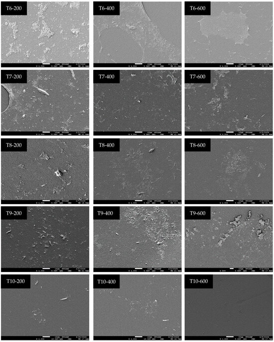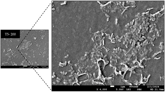Table 1 presents the efficacy of calcium hypochlorite (Ca(ClO)2) in sanitizing tubing at various contact times and concentrations, and Figure 4 and Figure 5 provide visualizations of the tubing samples’ interiors, corresponding to the data in Table 1. Sanitizing with 200 ppm Ca(ClO)2 for 10 min (T1-200) and 1 h (T2-200) resulted in reductions of 2.4–2.9 log, 1.6–2.2 log, and 2.3–3.3 log for Pseudomonas spp. mold and yeast, and psychrotrophic microorganisms, respectively, compared to the initial microbial load. Sanitizing with 400 ppm Ca(ClO)2 for 10 min (T1-400) achieved reductions of 2.6 log, 2.6 log, and 2.8 log for Pseudomonas spp. mold and yeast, and psychrotrophic microorganisms, respectively. Sanitizing with 600 ppm Ca(ClO)2 for 10 min (T1-600) effectively inactivated microorganisms within the tubing, as evidenced by the lack of recovery in the enrichment process. However, observation of the SEM image (T1-600 in Figure 4) revealed some microorganisms are present. This suggests that, while microbial cells were present, they were likely injured or in a non-culturable state and thus failed to be resuscitated by culturing with media. Interestingly, sanitizing with 200 ppm Ca(ClO)2 for 6 weeks (T5-200) did not completely eliminate microorganisms, as indicated by their growth after the enrichment process. Moreover, the microbial data (Table 1) and SEM images of T2-200 (Figure 4) and T7-200 (Figure 5) show re-colonization after 6 weeks of tubing storage. The SEM images were selected to provide an overview of the sanitizing efficacy. However, an enlarged image of T5-200 was presented in Figure 6 due to an unexpected result: microbial growth was observed after sanitizing with 200 ppm for 6 weeks.