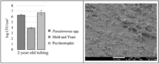 The lab-scale microbial mass buildup and sanitation study was conducted independently twice. Microbial counts were expressed as logarithms of the number of colony-forming units (CFU) per cm2 of tubing, with microbial data reported as mean ± standard deviation. In cases where no colonies were detected through direct plating, microbial presence was assessed by observing turbidity compared to a sterilized growth medium blank (TSB). Since visible turbidity typically indicates microbial growth during the enrichment process, but the initial level cannot be quantified, turbid TSB was recorded as “<0.83 log CFU/g (detection limit)”, whereas clear TSB, indicating no growth, was recorded as “not recovered”. In other words, “not recovered” indicates that no culturable cells were observed through the enrichment process. The SEM images were captured at various magnifications (×50 to ×4000), and images that best depicted the overall tubing surface were selected for representation.