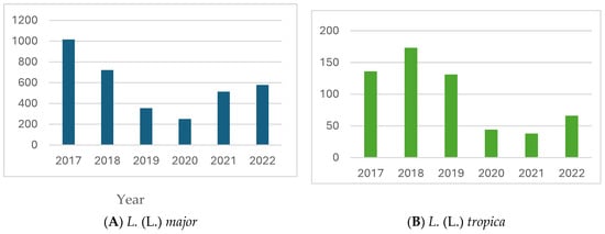 Between 2017 and 2022, a total of 4168 cases of leishmaniasis were reported by the five sites in Israel. The annual number of reported cases varied from 1160 in 2017 to the nadir of 317 cases in 2020, with a subsequent increase in 2021 and 2022 (Figure 2). This trend in case numbers during 2019–2020 was observed across all tested species, as illustrated in Figure 3 for L. (L.) major and L. (L.) tropica, while in the South American species, the decline was during 2020–2021, correlating with the COVID-19 pandemic-related travel restriction (Figure 4).