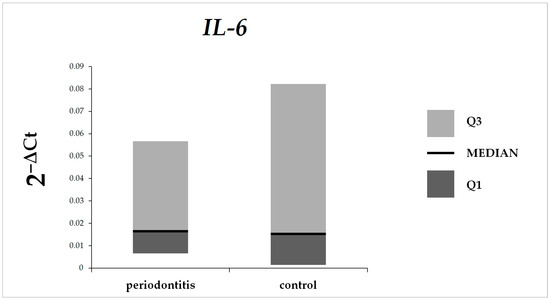 Total mRNA was extracted from gingival tissue samples (50–100 mg) from vestibular area using the RNeasy Mini Kit (Qiagen, Hilden, Germany). The RNA (0.5 µg) was reverse-transcribed with the RevertAid First Strand cDNA synthesis kit (Thermo Scientific, Waltham, MA, USA) according to the manufacturer’s protocol. Quantitative expression analysis of IL-6 was performed using qRT-PCR on an ABI PRISM® Fast 7500 Sequence Detection System (Applied Biosystems, Waltham, MA, USA). The thermal cycling conditions were as follows: 95 °C for 15 s, followed by 40 cycles at 95 °C for 15 s and 60 °C for 1 min. Expression levels of IL-6 and endogenous control were determined by CT values measured in duplicate. Data normalization was performed based on the reference gene β2-microglobulin. To calculate the values, the 2−ΔCt method was used. The sequences of used primers were prepared according to the sequence information obtained from the NCBI database and were synthesized by Oligo.pl (IBB PAN, Warszawa, Poland) manufacturer.