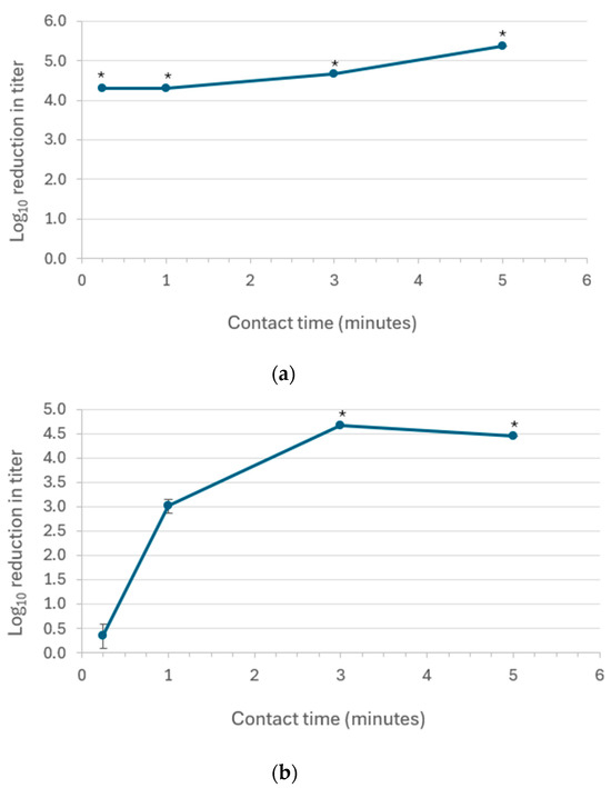 Time kinetics of the inactivation of poliovirus type 1 Chat strain on stainless-steel carriers at room temperature by (a) 5000 ppm sodium hypochlorite; and (b) 95% v/v ethanol. The values shown are the mean ± standard deviation for n = 3 independent replicate runs. * Inactivation was complete (no residual infectious virus was detected), and, therefore, the log10 reductions depicted are to be interpreted as “≥” the values shown.