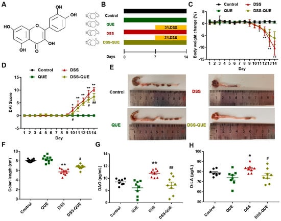 QUE treatment relieved DSS-induced colitis. (A) QUE chemical structure. (B) Experiment treatment timeline. (C) The change in body weight. (D) Disease activity index (DAI) score of mice. (E) Representative morphological images of colon tissue. (F) The length of the colon. (G,H) Serum levels of DAO and D-LA. The results are expressed as the mean ± SEM (n = 8). * p < 0.05, ** p < 0.01 vs. the Control group; # p < 0.05, ## p < 0.01 vs. the DSS group.