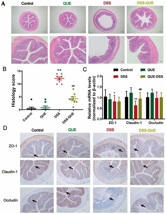 Effect of QUE on TJ proteins in the colon. (A) H&E staining of colon tissue sections from each group, original magnification, above: ×40, below: ×100. (B) Histological scoring of the colon (n = 8). (C) Relative mRNA expression of ZO-1, Claudin-1, and Occludin in the colon of mice was detected by quantitative real-time PCR (n = 4). (D) Immunohistochemistry analysis on ZO-1, Claudin-1, and Occludin in colon sections from different groups (n = 3), original magnification ×100. * p < 0.05, ** p < 0.01 vs. the control group; ## p < 0.01 vs. the DSS group. The arrow represents where the protein is expressed.