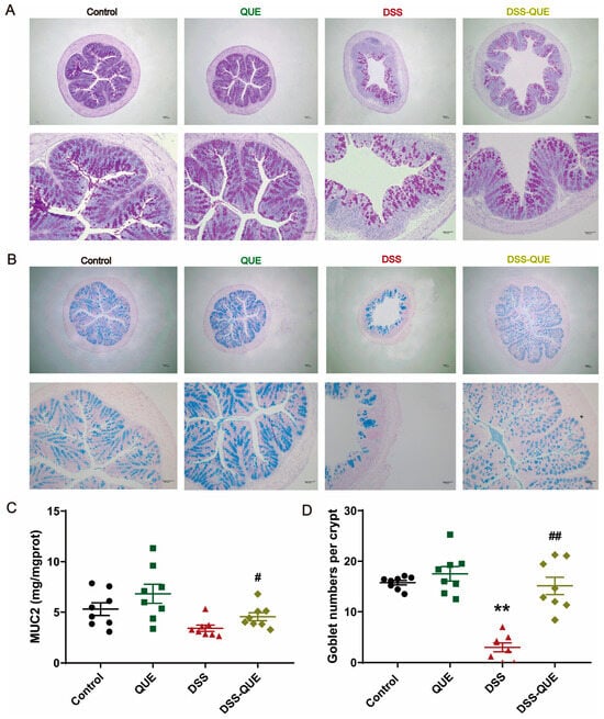 Effects of QUE on the mucous layer. (A) Alcian blue staining, original magnification, above: ×40, below: ×100. (B) Histological sections of the colon (stained with PAS), original magnification, above: ×40, below: ×100. (C) Concentration of MUC2. (D) Number of goblet cells. The results are expressed as the mean ± SEM (n = 8). ** p < 0.01 vs. the control group; # p < 0.05, ## p < 0.01 vs. the DSS group.