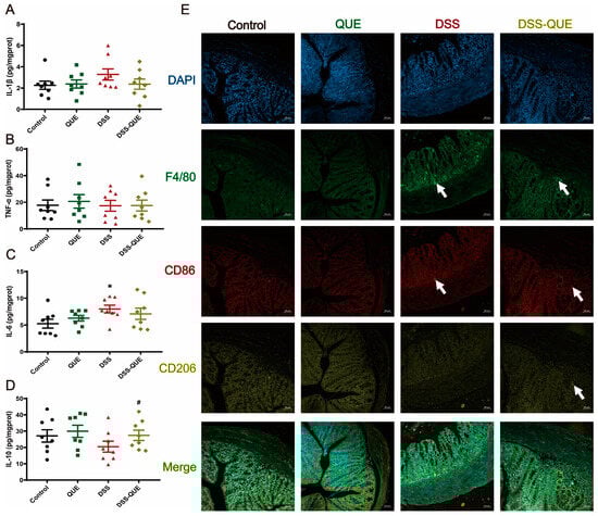 QUE regulated inflammation and macrophage polarization in DSS-induced colitis mice. (A) IL-1β level in colon. (B) IL-6 level in the colon. (C) TNF-α level in the colon. (D) IL-10 level in the colon. The results are expressed as the mean ± SEM (n = 8). (E) Immunostained with DAPI (blue), F4/80 (green), CD86 (red), and CD206 (yellow) in colon tissue, original magnification ×100 (n = 3). * p < 0.05 vs. the control group; # p < 0.05 vs. the DSS group. The arrow represents where the protein is expressed.