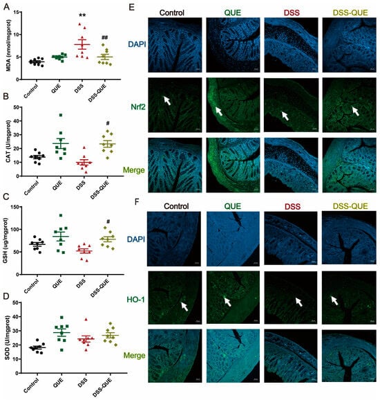 Effects of QUE on the activity of oxidative stress-related enzymes and the Nrf2/HO-1 pathway in the colon. (A) The level of MDA in the colon. (B) The activity of CAT in the colon. (C) The level of GSH in the colon. (D) The activity of SOD in the colon. The results are expressed as the mean ± SEM (n = 8). (E) Representative immunofluorescence images of Nrf2 in the colon (n = 3), original magnification ×100. (F) Representative immunofluorescence images of HO-1 in the colon (n = 3), original magnification ×100. ** p < 0.01 vs. the control group; # p < 0.05, ## p < 0.01 vs. the DSS group. The arrow represents where the protein is expressed.