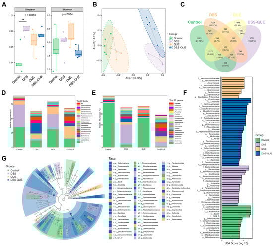 The composition of the colon microbiota was altered by QUE administration in colitis mice. (A) Shannon and Simpson indexes were used to estimate alpha diversity. (B) Gut microbiota principal component analysis (PCA) plot. (C) Venn diagram of ASVs. Relative abundance of predominant bacteria was shown at the family (D) and genus (E) levels. (F) Taxonomic cladogram of LEfSe analysis. (G) Linear discriminant analysis (LDA) score for different taxa abundances. Data were expressed as means ± SEM (n = 5). ** p < 0.01.