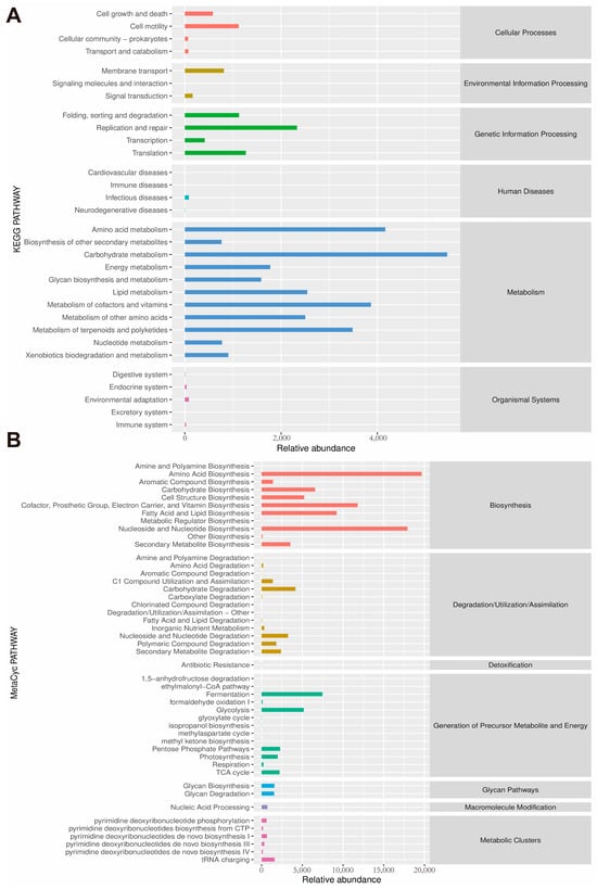 The pathway of different abundances of microbiota. (A) The pathway of different abundances of microflora at KEGG levels. (B) The pathway of different abundances of microflora at MetaCyc levels.