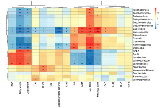 As shown in Figure 8, the relationship between the 23 most abundant genera and various parameters, including the DAI, pathological score, colon length, levels of inflammatory cytokines, and several key regulators involved in oxidative stress, were analyzed. Bacteroides and Bacteroidaceae abundance exhibited a significant positive correlation with TNF-α, IL-6, IL-1β, MDA, DAO, DAI score, and pathological score. Conversely, these genera exhibited a significant negative correlation with body weight, colon length, goblet cell numbers per crypt, and the levels of SOD, CAT, GSH, and IL-10 in the colon. In addition, Lactobacillaceae, Lactobacillus, and Lactobacillales abundance, which decreased in the DSS and DSS-QUE group, were significantly negatively correlated with IL-6, MDA, DAI score, and pathological score, while showing a significant positive correlation with body weight and colon length. Interestingly, the abundance of Akkermansia exhibited a significant positive correlation with the MUC2 levels in the colon. Collectively, these findings indicate that QUE treatment alleviates intestinal inflammation and oxidative stress, potentially through the increase in the abundance of Lactobacillaceae, Lactobacillus, and Lactobacillales, alongside a decrease in the abundance of Bacteroides and Bacteroidaceae.
