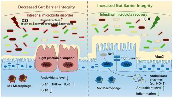The current results collectively demonstrate that the primary mechanisms through which QUE significantly alleviated DSS-induced clinical symptoms and colon injury include the inhibition of colonic inflammation, the preservation of intestinal barrier integrity, and the regulation of oxidative stress and gut microbiota (Figure 9). This study elucidates the relationship between intestinal microbiota and environmental factors that influence intestinal integrity, including oxidative stress and the inflammatory mucosal barrier, through association analysis. Furthermore, it investigates the mechanisms by which QUE mitigates intestinal injury, thereby offering a theoretical foundation for the clinical application of QUE in the treatment of colitis.