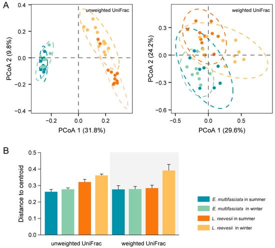 Results of principal coordinates analysis (PCoA) on gut microbiota (A) and mean values (+SE) for distance to centroid (B) in a combination of two host species (E. multifasciata and L. reevesii) × two seasons (summer and winter). Each color in the figure represents a species × season combination (See the explanation on the right side of Plot B).