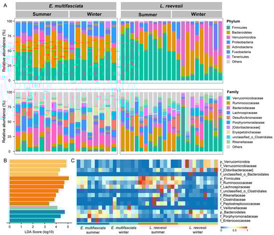 The relative abundance of gut microbiota at the phylum and family levels in a combination of two host species × two seasons (A), the three phyla and 12 families of gut microbiota identified by LEfSe that differed significantly in relative abundance among the four combinations (B), and heatmap showing the relative abundance of each significantly differentially abundant phylum or family (C).