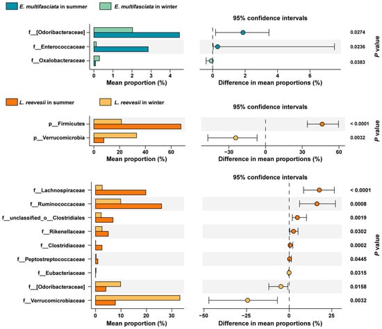 Twelve microbial families differed among the four host species × season combinations in terms of relative abundance (Figure 2B). Bacteria of the families Enterococcaceae (LDA = 3.86, p < 0.01) and Porphyromonadaceae (LDA = 4.38, p < 0.01) were enriched in E. multifasciata in summer. Bacteria of the family Veillonellaceae were enriched in E. multifasciata in winter (LDA = 4.10, p < 0.01). Bacteria of the families Clostridiaceae (LDA = 3.84, p < 0.01), Lachnospiraceae (LDA = 4.63, p < 0.01), Peptostreptococcaceae (LDA = 3.39, p < 0.01), Rikenellaceae (LDA = 3.97, p = 0.02), Ruminococcaceae (LDA = 4.70, p < 0.01), and unclassified_o_Clostridiales (LDA = 4.18, p < 0.01) were enriched in L. reevesii in summer. Bacteria of the families Odoribacteraceae (LDA = 4.32, p = 0.01), Verrucomicrobiaceae (LDA = 4.87, p < 0.01), and unclassified_o_Bacteroidales (LDA = 4.17, p = 0.01) were enriched in L. reevesii in winter. Bacteria of the families Odoribacteraceae and Enterococcaceae were more abundant in summer than in winter and bacteria of the family Oxalobacteraceae were more abundant in winter than in summer in E. multifasciata (Mann–Whitney test, all p < 0.04) (Figure 3). Bacteria of the families Lachnospiraceae, Ruminococcaceae, unclassified_o_Clostridiales, Rikenellaceae, Clostridiaceae, and Peptostreptococcaceae were more abundant in summer than in winter, and bacteria of the families Verrucomicrobiaceae, Odoribacteraceae, and Eubacteriaceae were more abundant in winter than in summer in L. reevesii (Figure 3).