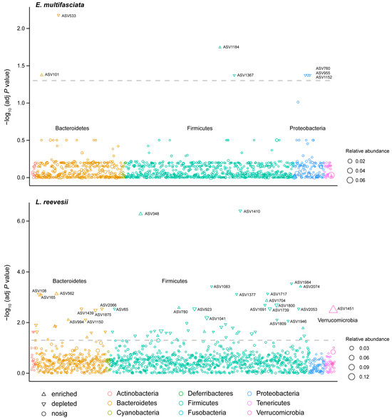 Manhattan plots showing the ASVs that differed significantly in relative abundance between summer and winter. Each triangle or dot represents a single ASV colored by phylum. The dashed line shows the significance threshold (adjusted p < 0.05).