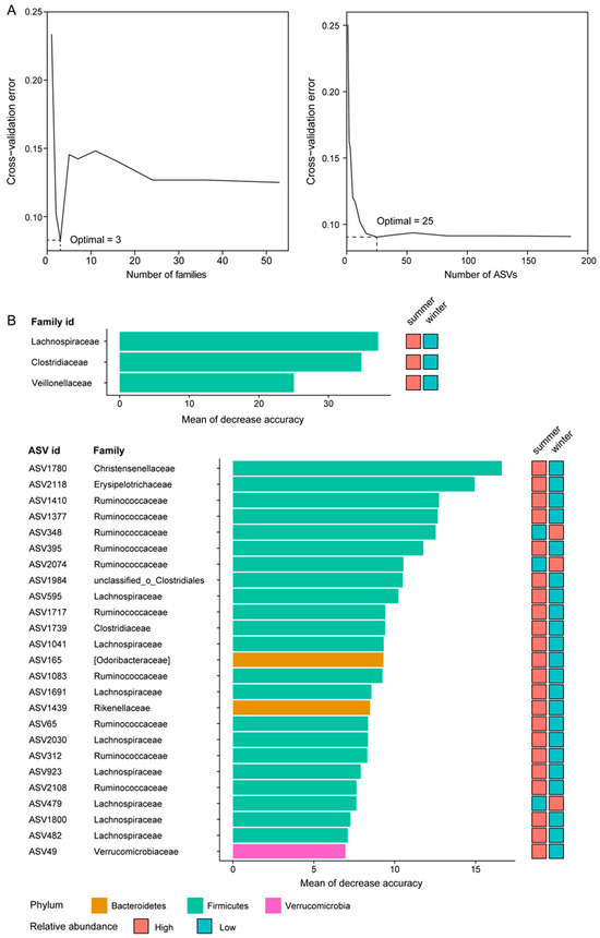 Random forest model detects biomarker taxa that are most associated with summer and winter individuals of L. reevesii. (A) 10-fold cross-validation error as a function of the number of family or ASV used to differentiate gut microbiota between summer and winter (A), and the top three families and 25 ASVs identified by a random forest model (B). Biomarker taxa are ranked in descending order of their importance to the accuracy of the model.