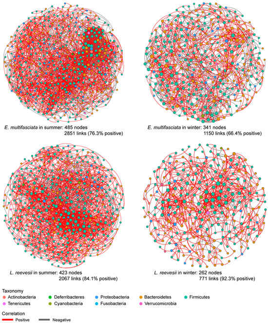 Gut microbial co-occurrence networks were more complex in summer than in winter in both species. In summer, the average connectivity degree was 11.8 in E. multifasciata and 9.8 in L. reevesii, and in winter, it was 6.7 in E. multifasciata and 5.9 in L. reevesii. Similarly, the number of connections (links) in the networks was greater in summer (2851 in E. multifasciata and 2067 in L. reevesii) than in winter (1150 in E. multifasciata and 771 in L. reevesii) (Figure 6). Most links (>84%) in the co-occurrence network were positively correlated in L. reevesii, whereas negatively correlated links increased over 23% in E. multifasciata (Figure 6). Firmicutes and Bacteroidetes were the top two dominant phyla within the co-occurrence networks in both species. Seasonal shifts in the taxonomic composition of the networks were evident in L. reevesii, as revealed by the fact that bacteria of the phylum Bacteroidetes accounted for 14.7% in summer and 30.2% in winter.