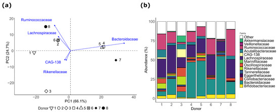 To assess the interindividual variation, PCA was performed at the family level, revealing marked differences in microbial composition between pIBD donors, with two principal components explaining 90.8% of overall variation (Figure 1a). Donors 4, 5, and 7 were characterized by elevated Bacteroidaceae abundances, while the remaining donors were characterized by elevated levels of Ruminococcaceae (donor 8), Lachnospiraceae (donors 2, 6, and 8), and Rikenellaceae (donors 1 and 3; Figure 1a,b).