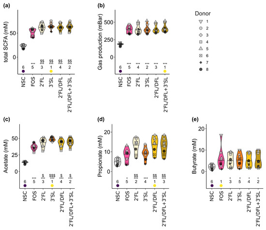 Impacts of HMOs and HMO blends on short-chain fatty acid (SCFA) profile and gas production of pIBD fecal microbiota. Violin plots of (a) total SCFAs, (b) gas production, (c) acetate, (d) propionate, and (e) butyrate levels. Plots depict mean and individual microbiota values for each donor (n = 8). The ranks of mean values per treatment are indicated at the bottom of the figure, with the lowest average being indicated in purple and the highest value in yellow. Significant effects between NSC and treatments are depicted with * (padjusted ≤ 0.05) and *** (padjusted ≤ 0.001). Significant effects between FOS and treatments are depicted with $ (padjusted ≤ 0.05), $$ (padjusted ≤ 0.01), and $$$ (padjusted ≤ 0.001).